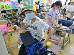 先日お伝えした通り、今日は市内一斉のタブレット持ち帰りです。あいにくの雨降り下校となってしまいましたが、帰りの会の時間に、「雨に濡れないように大切に入れてね!」の先生の言葉を聞き、子どもたちは鞄の中にそっと片付けたり、布でくるんでから鞄にしまったりする姿が見られました。タブレットの性質を理解し、丁寧に扱う姿が見られて嬉しく思いました。