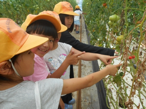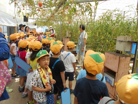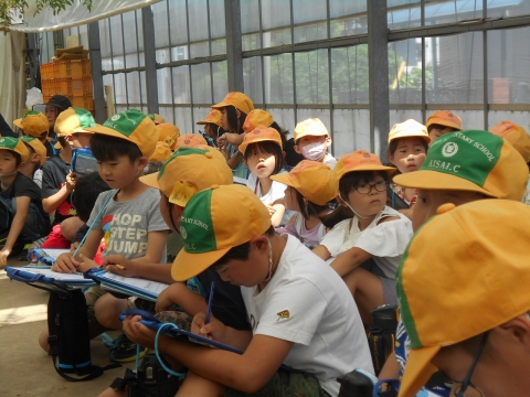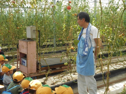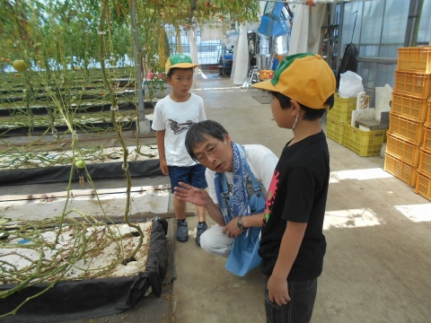2年生は5月の上旬から、1人1鉢ずつ野菜を育てています。また、農園でもみんなでトマトなどの野菜を育てています。これは生活科の学習です。この学習をさらに深めるため、今日の2~3時間目にトマト農家の川村さんを訪問しました。川村さんは、トマトをビニールハウスで育てており、トマトをはじめとする野菜の育て方をわかりやすく丁寧に教えていただきました。実際においしそうなトマトが育っている様子を目の当たりにし、2年生のみんなは、自分が育てている野菜を大切に世話していこうと意欲を高めていました。トマトのお土産もいただき、みんな笑顔で学校にもどってきました。お忙しい中、2年生の児童へわかりやすく教えていただいたトマト農家の川村さん、ありがとうございました。