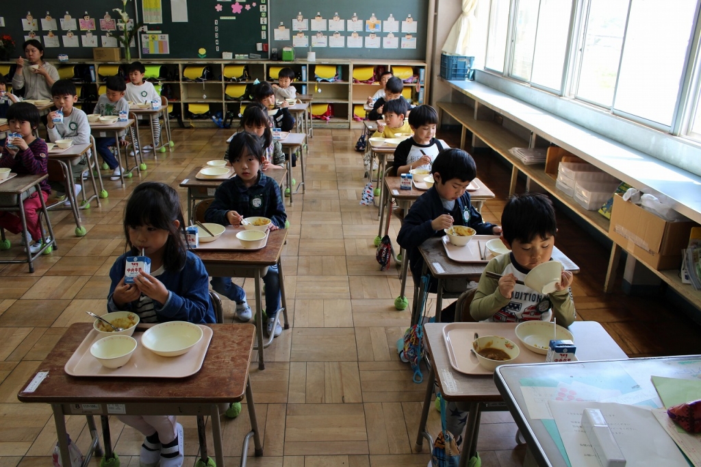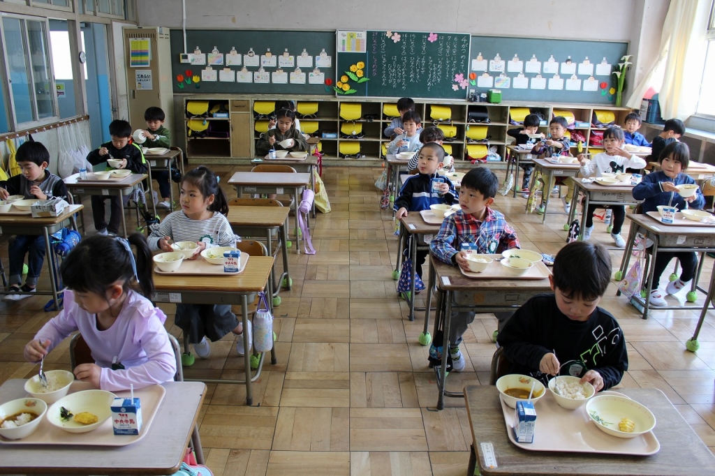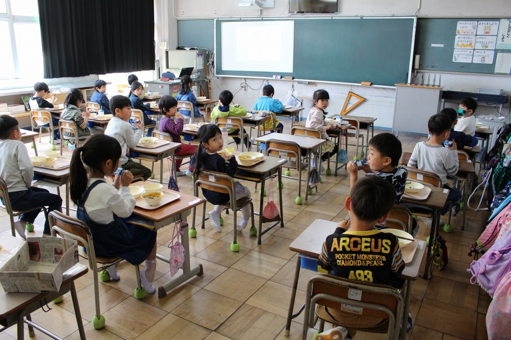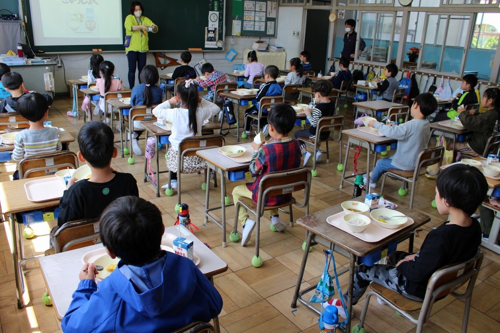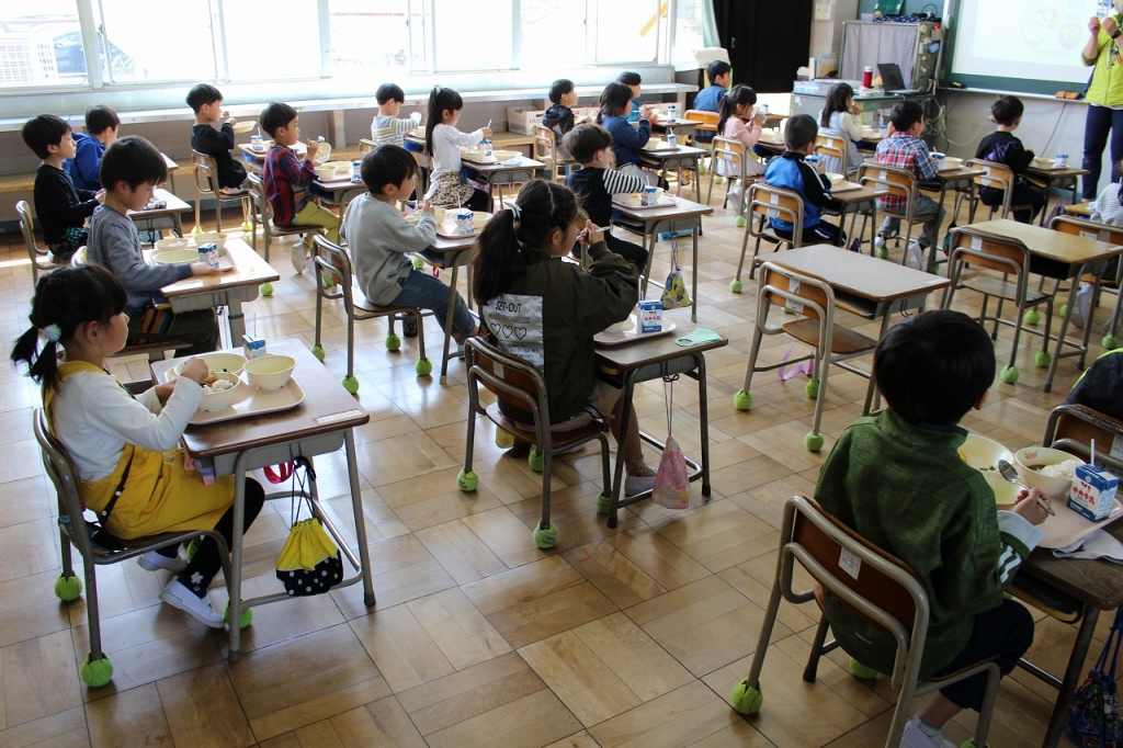 またこの日から、一年生の子たちの給食がスタートしました。本日の給食のメニューは・・・みんな大好きカレーライスです!!初めての給食と言うことで、4時間目の途中から配膳を始めました。どの子も先生の言うことをしっかり聞いて、手際よく準備をすることができました。もちろん感染症予防のために前を向き、おしゃべりせずに静かに食べました。みんな大満足の表情でした。初めての給食はおいしかったかな?