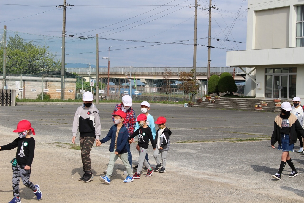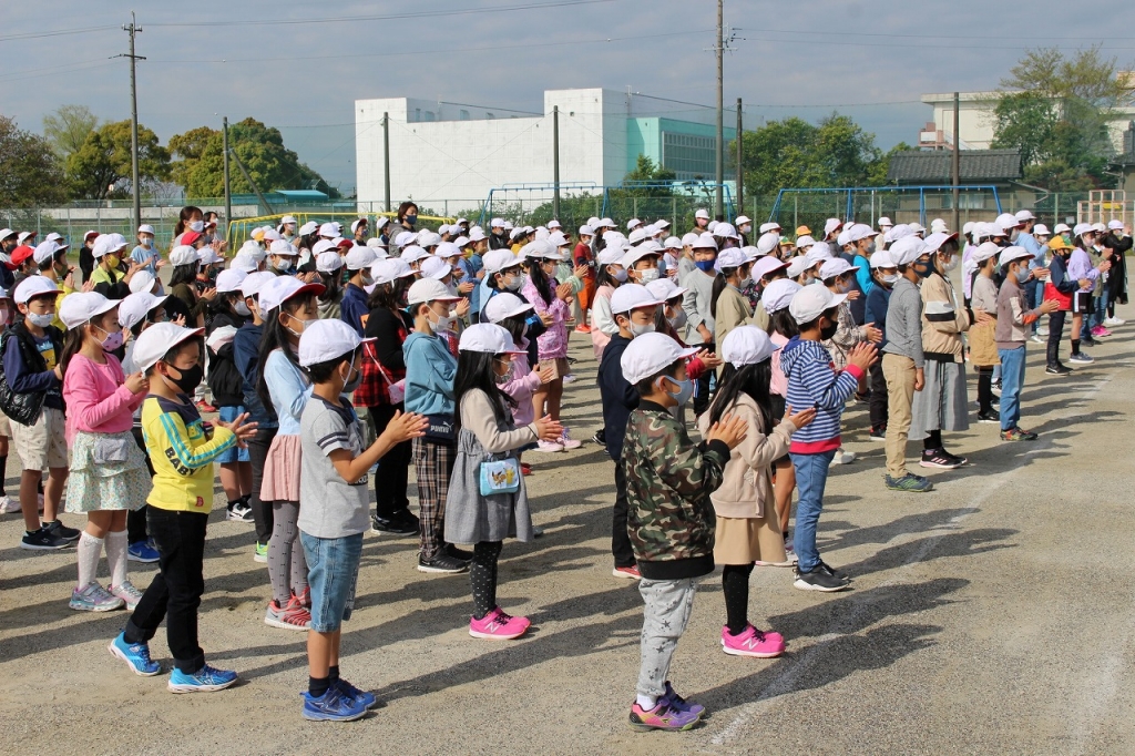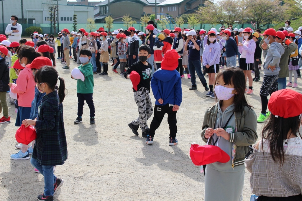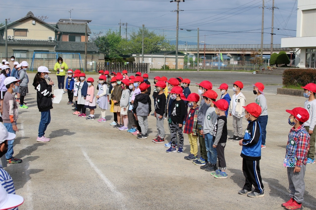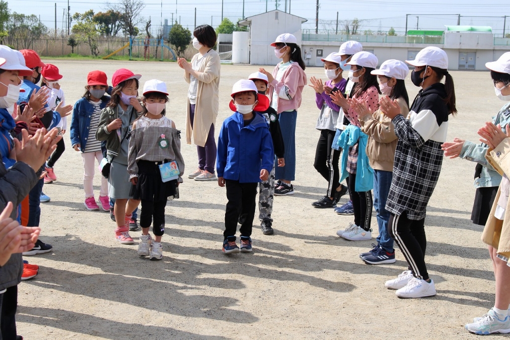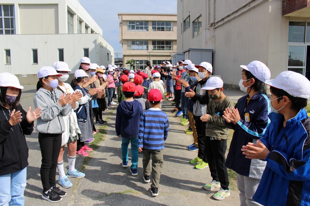 そんな中、4月12日(月)、全校朝礼の時間を使って一年生を迎える会を行いました。入場は6年生のお兄さん、お姉さんに手を引かれて、2~5年生が見守る中、運動場に入ってきました。児童会長のあいさつの後、永和小クイズを行いました。みんなで楽しむことができ、永和小学校のことを少しでも知ってもらえるようにと、児童会役員がクイズを考えました。クイズは全部で3問でしたが、児童会役員の子が中心となり、盛り上げてくれました。一年生の退場は5・6年生が通路を作り、拍手の中退場していきました。全校が一緒に楽しむことができ、心温まる会となりました。