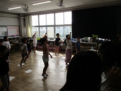 リーダーが各クラスに分かれ、中学校からもらった応援動画をもとに説明をし、みんなの前で実際に踊って見せます。新しい踊りにわくわくしながら動画やリーダーの手本を見る子もいます。応援の流れを知ったら、いよいよダンスの実践です!「右、左、くるくるくるくる!」リーダーのかけ声に合わせてクラス全体が踊ります。リーダーも次々と指示、説明を続け、次のステップへ進んでいきます。「お茶飲んできていいよ~!」休憩を取ることも忘れません。練習を重ね、この1時間で一通りの応援の形を各クラスに伝えることができました!明後日の準備は万全ですね♪