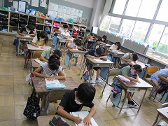 1、2年生は硬筆です。2年2組の子たちも、お手本をまねて、まっすぐ丁寧に書いていきます。静かに集中する姿はとてもかっこよく見えました。写真を撮られていることに気付かないくらい集中している子もたくさんいました。