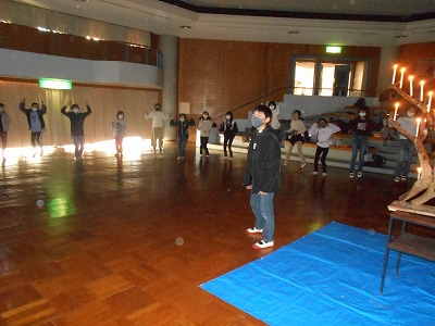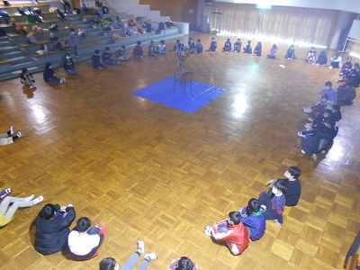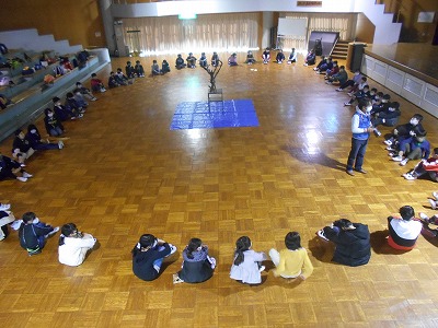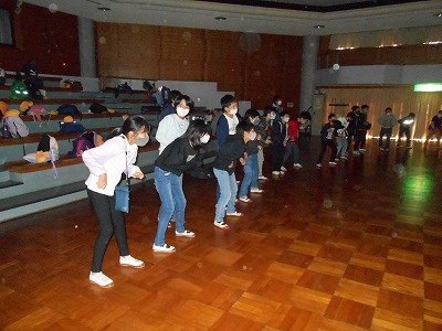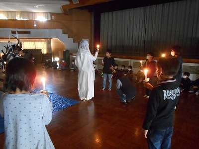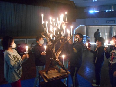 昼食後は午後からのプログラム、キャンドルサービスです。講堂の照明を落とし、みんなでキャンドルを囲んで火を灯します。厳かな雰囲気の中、火の女神が入場し、代表児童は火の女神から『情熱の火』『正義の火』『希望の火』『協力の火』『努力の火』『友情の火』の6つの火を分けていただき、燭台へ点火しました。きれいなキャンドルが燭台に灯ったら、いよいよお楽しみのボンファイヤーです。みんな、楽しい楽しいゲームで大いに盛り上がりました。 楽しい時間はあっという間に過ぎてしまいます。キャンドルサービスが終わったら退所式です。短い時間でしたが、所員の方に心から感謝の気持ちを伝えました。天気にも恵まれ、思う存分美浜の自然に親しむことができた教育キャンプでした。この経験を、これからの学校生活で活かしていってほしいと思います。帰りは予定より早く学校に到着しましたが、保護者の皆様のお迎え、ありがとうございました。ご家庭でもお子様の思い出話を聞いていただけると幸いです。