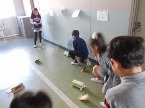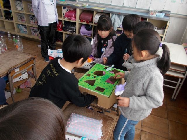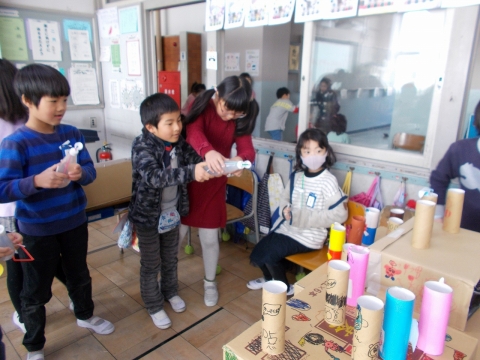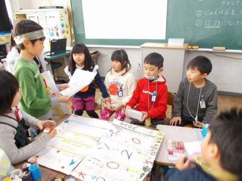 2年生では、1年生を招待して、いろいろな遊びやゲームで楽しんでもらう「えいわっ子ランド」を冬休み前から計画・準備していました。準備の段階では、グループでどんな遊びをすると1年生のみんなに楽しんでもらえるか考えたり、みんなで決めた遊びを協力して準備したり、授業参観で保護者の方をお客さんにして試したりと、えいわっ子ランドの成功のために取り組んできました。