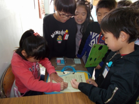 ボーリングや的あて、レースなど楽しい遊びがいっぱい!! 1年生のみんなは、全部の遊びやゲームを楽しもうと一生懸命にまわっていました。そんな1年生の児童たちを2年生のみんなは、わかりやすく説明したり、優しく教えてあげたりと、お兄さん、お姉さんとしての姿がたくさん見られました。遊びやゲームが終了するたびにもらうスタンプを1年生のみんなはたくさん集め、とても満足気でした。そんな1年生の姿から、えいわっ子ランドの成功を2年生みんなで感じ取っていました。