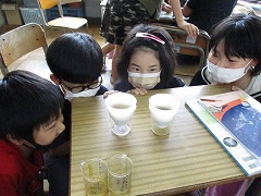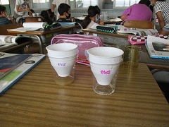 実験が始まってしばらくすると、子どもたちからつぶやき声聞こえてきました。「きれい・・・」一方のカップには、茶色い泥水がしみ出てきたのですが、もう一方には、上から注いだ水とあまり変わらない透明感のある水が出てきたからです。土や砂を通過するので、どちらも泥水が出てくるのではないかと予想したのでしょうね。