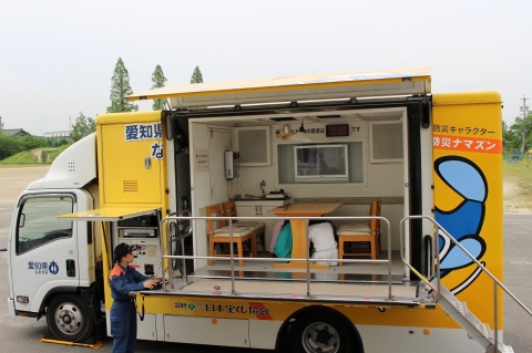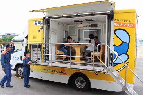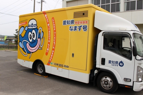 なまず号は、地震体験ができる車です。愛知県が所有している地震体験車「なまず号」が今日、永和小学校へやってきました。愛西市消防本部の方が講師となり、なまず号を使った地震体験が4・5・6年生で行われました。