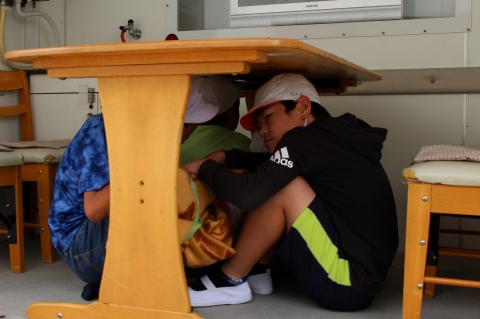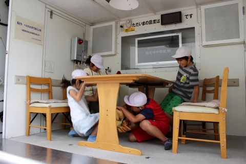 今回のなまず号は、東日本大震災の時の揺れを体験できる設定になっていました。最初いすに座り、揺れを感じるとすばやくテーブルの下へ頭を守るように避難しました。その後、震度5、震度6弱、震度6強、震度7と今までに体験したこともない揺れの中、テーブルの下でしがみついて耐えていました。震度5を超えていくと立っていることができない状態になりました。震度6を超えると、揺れの激しさにおもわず悲鳴を上げる児童もいました。愛知県周辺では、震度5を超える揺れを大人の人でもほとんど経験していません。今回の体験は、地震の恐ろしさを改めて感じ取るとともに、大きな揺れを体感したことで、いざという時のために役立つ経験になったと思います。永和小学校では、今後も防災対策、防災訓練、防災教育をしっかり取り組んでいきたいと思います。