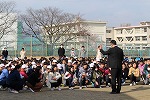 2時間目後の休み時間にサイレンともに地震による避難訓練の放送が入ると、子どもたちはシェイクアウト(身を低く、頭を守る、じっとしている)を基本に、事前指導(各場所での避難の仕方)のように行動し、運動場に速やかに避難することができました。