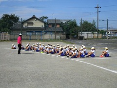 2時間目は、3、4年生の徒競走練習でした。まずは入場です。今回の運動会は、入場門・退場門がありません。ですので、控え席からそのまま前に出て色別に並び、待機位置まで走ってきてから走る順番に並び替える形の入場練習でした。同じ列の子に声をかけ、前後左右を整えて並ぶことができました。次は競技です。本番で使う雷管を1回だけ鳴らしたのですが、思いの外音が大きかったのか、思わず「おおっ!」と声が出てしまう子がたくさんいました。徒競走は、転ぶ子もなく順調に行うことができました。また、ゴールの瞬間に先生から着順を聞き、素早く着順旗の位置へ並ぶことができ、素晴らしいなと思いました。