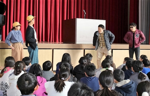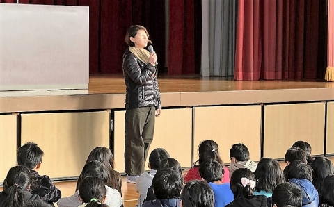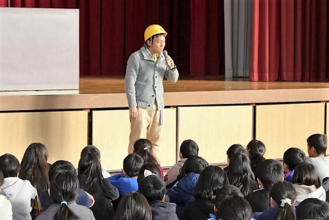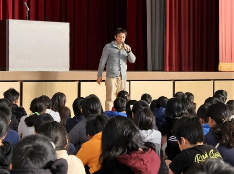 冷たさを感じる朝の体育館の中で、シーンと静かに待つ全校児童。冬休みを前にうきうきした気持ちをおさえ、落ち着いた態度で、冬休み前集会がスタートしました。校長先生からは、「ありがとう」という言葉、感謝の気持ちを大切に年末年始も、これからも過ごしてほしいというお話がみんなへ贈られました。その後、西崎先生から冬休みの過ごし方についてお話がありました。特にお年玉など高額なお金を小学生でも手にすることがあるため、先生方による寸劇をもとに事件に巻き込まれないための方法を再確認しました。さらに山本先生から交通安全に関わるお話があり、自転車でのヘルメット着用の大切さを実演をもとに教えてもらいました。集会の最後には、夏休みの募集作品で優秀であった児童の表彰もありました。
