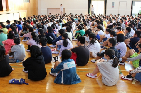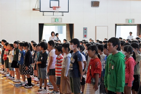 集会の最後には、全校児童で校歌を歌いました。みんな元気よく大きな声で歌いました。