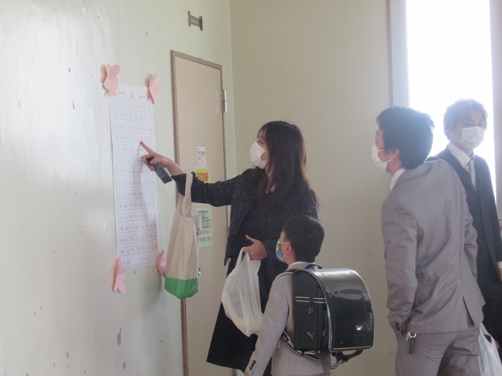 お家の人と一緒に体育館に入ったら、まずは自分のクラスの確認をしました。何組になったかな?お友達は何組だったのかな?と体育館壁面に張り出されたクラス割の名簿をしっかりと確認していました。クラスの確認が終わったら受付を済ませて、自分の席に座りました。そしてしばらく待ったら・・・いよいよ入学式の始まりです。