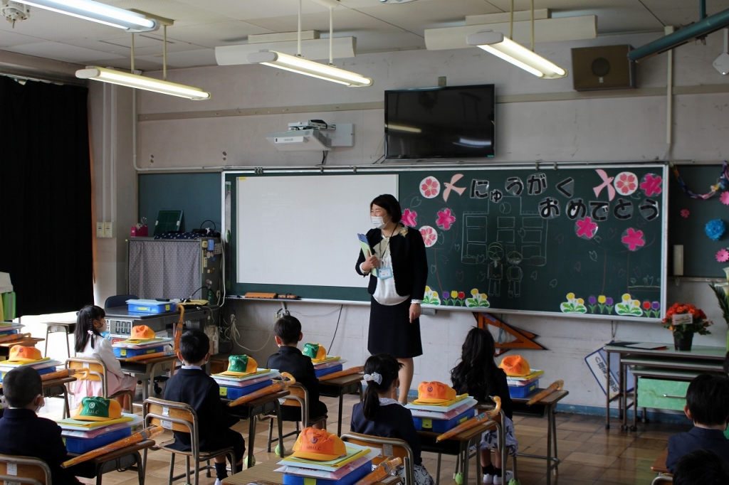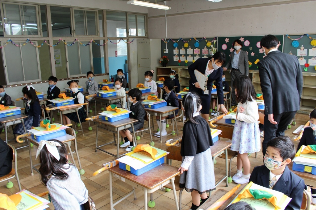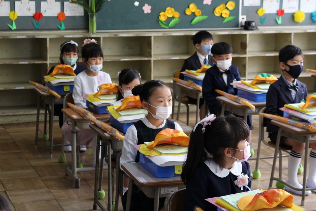 式の後は、担任の先生と一緒に教室へ移動しました。自分の机の上には新しい帽子や教科書、お道具箱が置かれていました。どの子も、これから始まる学校生活に胸を弾ませながら、机の上に積まれた様々な用具を見ていました。