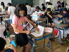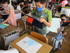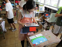 5-2は、まさに動画づくりの最中でした。色鉛筆を動かしてストーリーを作っていた子は、うれしそうに「先生、見てください!」と言って、作成途中のパラパラ動画を見せてくれました。動きに合わせて本人の解説が入り、色鉛筆たちの洞窟探検を上手に表していました。他にも、恐竜の骨が少しずつ組み上がっていく(一コマずつ骨を紙に描き足していく)動画や、ウミガメの産卵・孵化を表現した動画などを見せてもらいましたが、どれも、一人一人の工夫が光る学習になっていました。