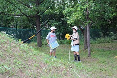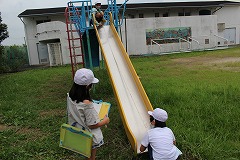 3年生は算数の授業で長さの学習をしています。今日の授業は運動場に出て、メジャーを使っていろいろな場所や物の長さを測りました。永和山の滑り台の長さを測ったり、コンビネーション遊具の高さを測ったり、永和山の周りの長さを測ったりと、学校中のいろいろな物を測りました。2~3人のペアになり、メジャーを持つ子や長さを記録する子など、それぞれ役割を分担しながら協力して取り組んでいました。事前に長さの予想をしていたので、自分の予想が合っているかどうか確かめようと、どの子も夢中になって調べていました。