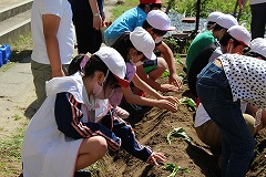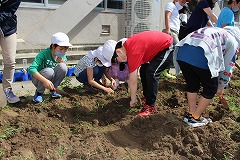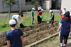 次はうね作りです。子ども達は、移植ごてを使って溝の土をうねの上に移動させていきました。最後に、うねの上を平らにならしてできあがりです。高学年の子の様子を見て、「〇〇くん、うまいねえ!」と先生からお褒めの言葉がありました。去年もやっているので、しっかり覚えていたのかな?