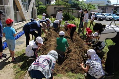 うねが完成したら、いよいよ苗を植えます。子どもたちは、うねに置かれた苗の前に座り、「苗の上に、優しく布団をかけてください」という先生の指示で、苗の茎にふんわりと土をかけていきました。最後に、全員で水やりをして植え付けは完了です。「いつ食べれるのかなあ?」という子どもたちの質問に、「100日後かな?」と先生。夏休み明けには大きく育ったサツマイモが収穫できるといいですね。