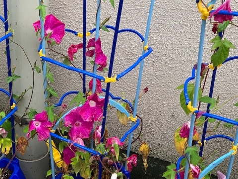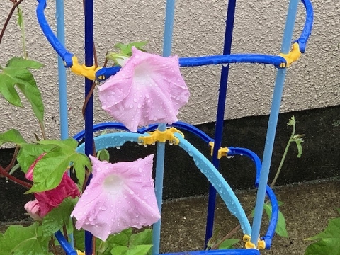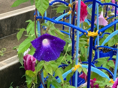 今朝、そのアサガオの様子を見に行くと、たくさん花を咲かせていました。