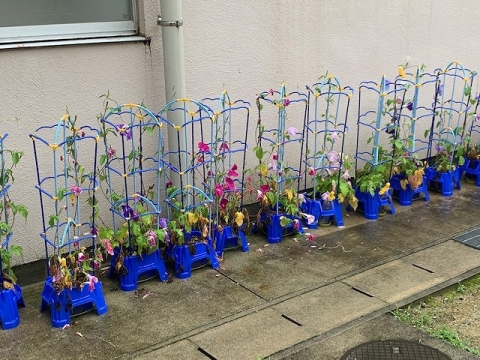 紫色の花が多かったですが、赤に近い紫や青に近い紫などいろいろな色の花が咲いていました。白に近い色の花もありました。アサガオの花は、朝のうちに花を開くため、登校した1年生の児童が、たくさん咲いているアサガオの花を見て、喜んでいました。アサガオの観察日記を書いたりとまだまだ学習のためにアサガオを育てていきます。これからもきれいな花をたくさん咲かせてほしいですね。