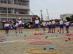 1・4年は、「ねらって投げろ!玉シュート」でした。フラフープを周りから囲み、フラフープの中に玉をだくさん入れたチームが勝つゲームです。ねらったフラフープが外れても、転がって隣のフラフープに入る子もいて、楽しんでいました。