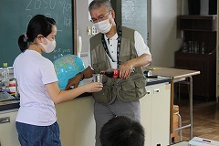 他にも、温暖化がどれほど暑いのか、ビニール袋をかぶって体感したり、海の水が二酸化炭素を吸収してくれていることを実験を通して実感したりしました。また、火力発電の仕組みを、ガスコンロやビーカー、歯車などを使って実験してもらい、蒸気が歯車を回している仕組みがよく分かりました。歯車が回った瞬間、「おぉ~」思わず子どもたちから感激の声が上がりました。