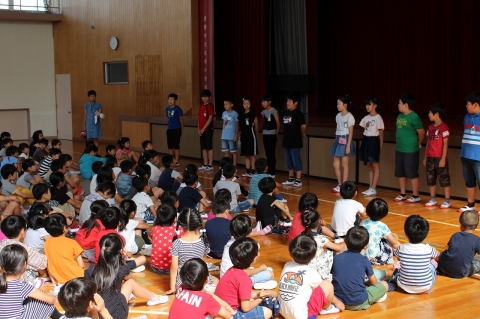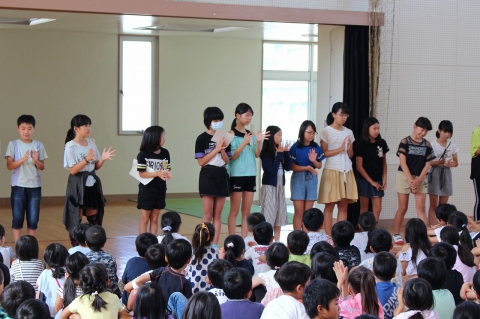 運動会の開催に先立って、6月17日(月)の朝、赤ブロック・白ブロックの結団式が行われました。6年生のブロック長を中心に、リーダーたちを紹介したり、応援の仕方を伝えたりしました。