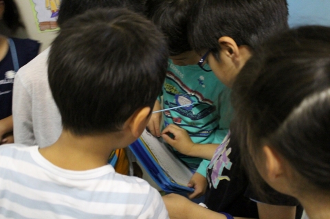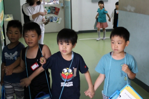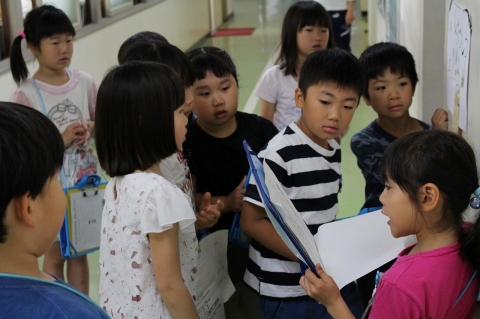 今日は「学校たんけん」の日です。お兄さん・お姉さんになった2年生が、1年生の子の手をとり、学校内を案内していました。2年生の児童は、この日のために各教室の看板を作り、その教室の説明を考え、1年生に上手に伝えられるように練習していました。そんな頼もしい2年生について、1年生のみんなは学校のいろいろな場所を覚えていきました。