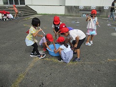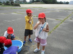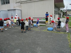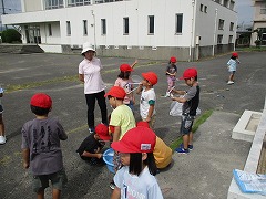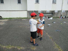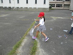 うちわを使った小さなシャボン玉はうまくでき、歓声も上がっていましたが、子どもたちが想像するような大きなシャボン玉は、ハンガーやストローを使ってもなかなかできません。「どうやるの?」と声に出す子もいました。2組では、大きなシャボン玉づくりの名人がいたので、みんなにやり方を教えてもらうことになりました。「ゆっくり吹くといいよ。」そのアドバイス通りにシャボン玉を作ると・・・1人、また1人と、直径10cmほどのシャボン玉が風に乗って飛び始めました♪ シャボン玉名人、ご指導、ありがとうございます!!