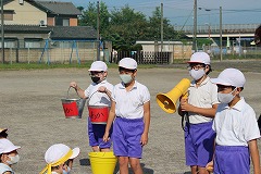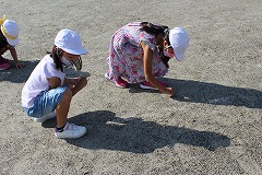 他の学年が朝読書をしている10分間が今年の石拾いタイムです。赤白黄の3色で競争しながら、委員会のお兄さんたちが持つ色別のバケツに、拾った石をどんどにれてい入れていきました。しかし、運動会経験が少ない1・2年生の中には、プールの前や鉄棒の下など、絶対に競技をしない場所まで足を伸ばし、石を拾う子が現れました。「そこの石拾いはしません」と先生に注意され、運動場の中央へ戻ってくる子どもたち。