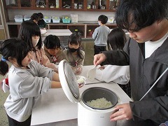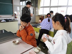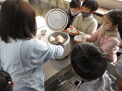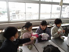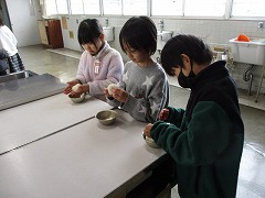突然「訓練、地震がきました。」の放送が流されました。運動場で遊んでいた子や大縄跳びの練習をしていた子たちは、急いで運動場の中央に集まっていきます。職員室にいた先生たちも、事務机などの下に入って次の放送を待ち、まずは一時避難を終えました。