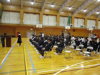 中学校生活を楽しく充実したものにしていくために心がけてほしいことが三つあります。第一は「心身ともに健康であること」です。丈夫な身体と健全な心はすべての基本になります。日頃から部活動などに励んで体力をつけ、自分の将来を見据えて夢の実現のために努力をしてください。