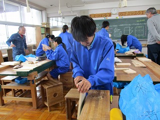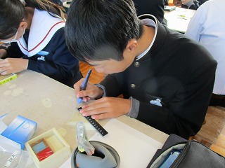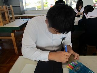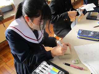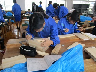 自分でデザインを考え、木箱に転写して、彫刻刀で彫っていきます。