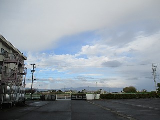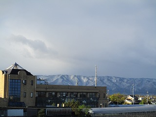 朝、図書室の窓から旧八開庁舎の方を見ると、山脈に白い冠が・・・。