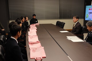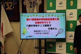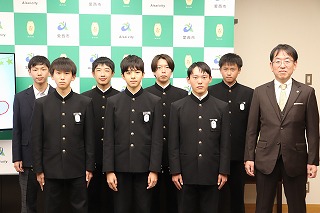 11月26日(水)、男子ソフトテニス部の7名が愛西市役所へ行き、愛西市長を表敬訪問しました。今年の夏の大会で地区大会と西尾張大会を勝ち抜き、県大会団体3位により東海大会へ出場した男子テニス部。市長さんからは大会の様子や今後の活動への意気込みなどを聞かれました。8名のうちの7名の3年生は部活動を引退し、現在進学に向けて準備中。部活動で鍛えた集中力を学習にも活かしてほしいと思います。残された2年生は、この金字塔を目標にさらに飛躍することを期待しています。
