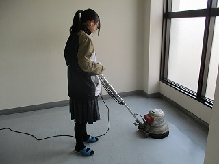 八開中学校では、年度末に向けてポリシャーという掃除機器を使い、教室や廊下の黒ずみを落としていきます。特別清掃(特掃)の担当の生徒が体育館渡りなどをきれいにしています。なかなか汚れは手強いですが、きれいになった体育館渡りを見てみてください。