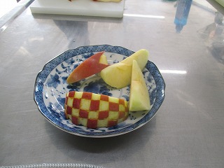 ただ皮を剥くのではなく、うさぎや市松模様などの包丁の使い方の実習でした。