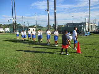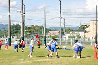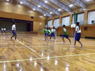 三人一組でコーンを回りながら、棒をつないでいきました。