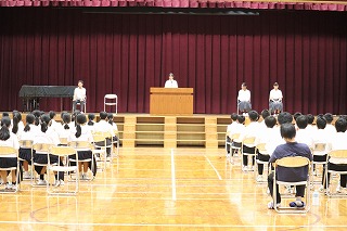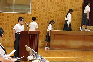 選挙管理委員会の生徒が進行をし、立候補者が全校生徒の前で演説しました。