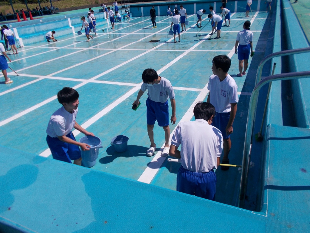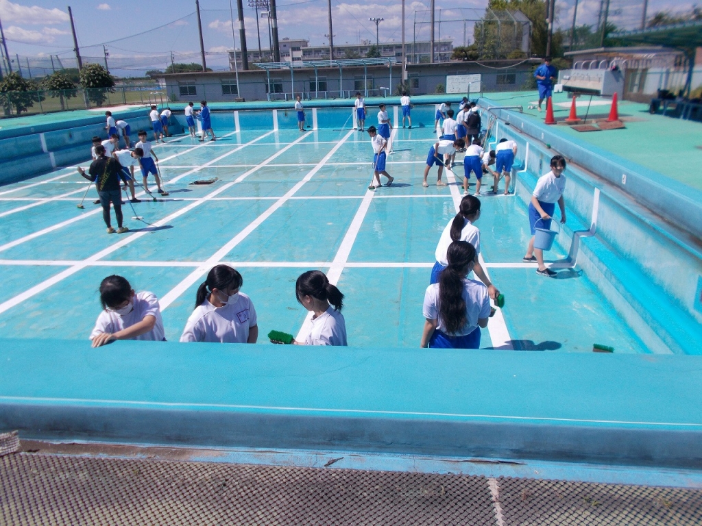 定期テストが終わった後、学年ごとにプール清掃を行いました。
