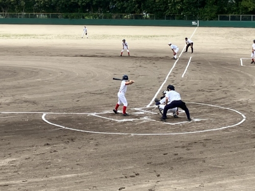 雨で延期になっていた野球部の試合が始まりました。一回終了時点で2-0でリードしています。