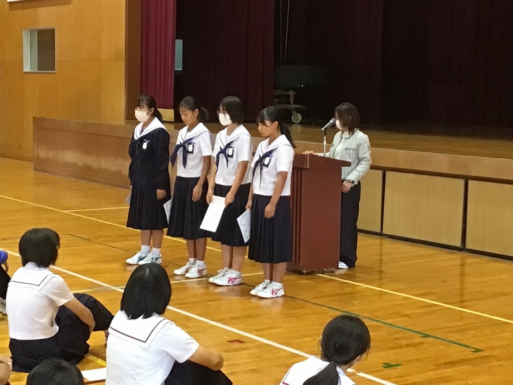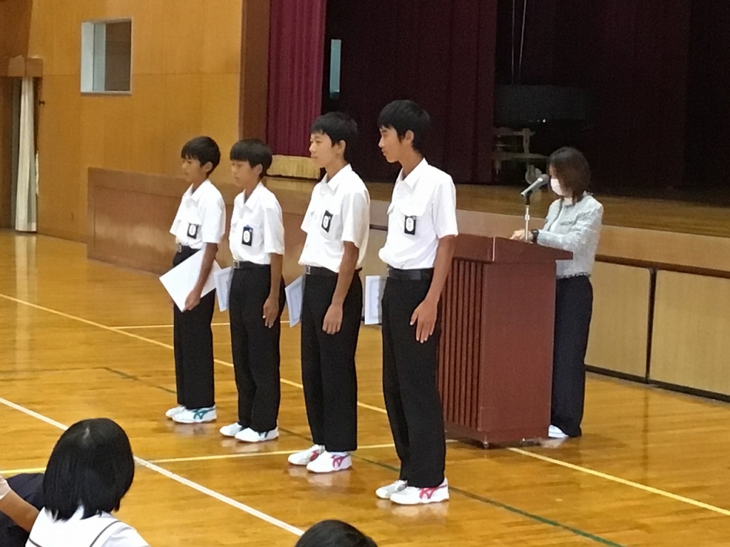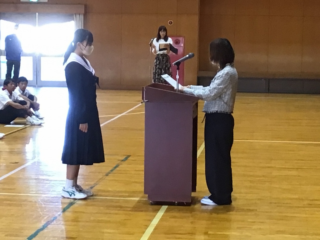 後期初めの朝礼では、後期生徒会・学級委員の認証を行いました。