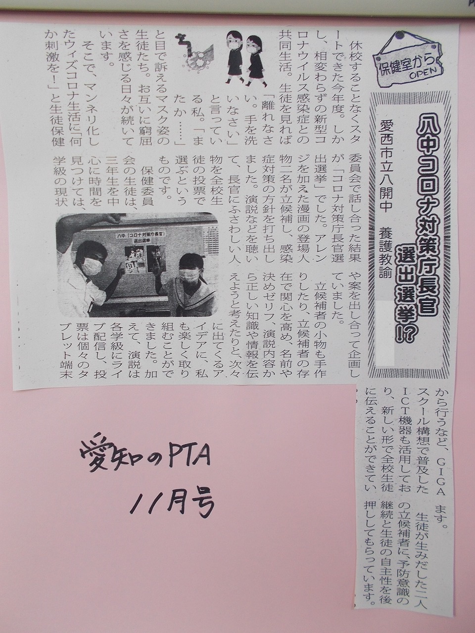 本校の養護教諭が執筆した記事が、今回のPTA新聞に載っています。保健委員会で行った「コロナ対策庁長官選挙」についてです。