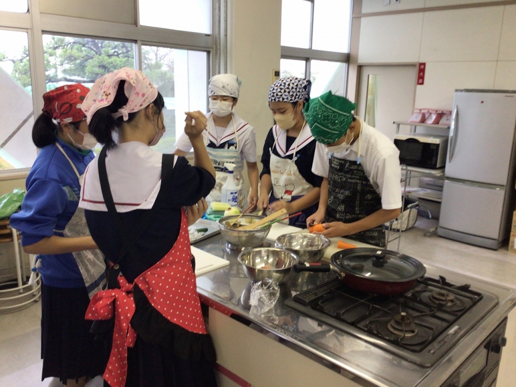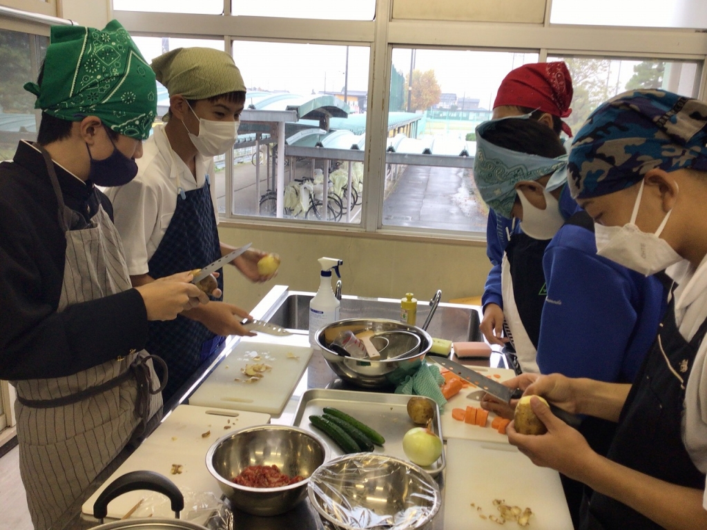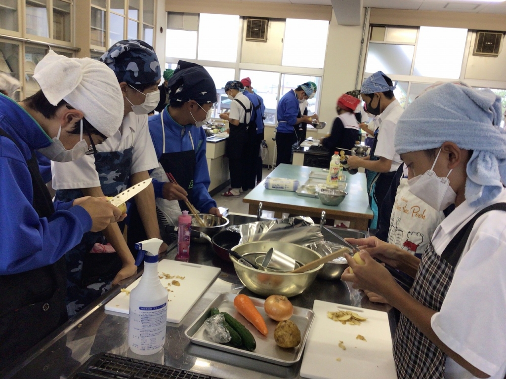2年生がグループに分かれて「肉じゃが」「酢の物」を作りました。