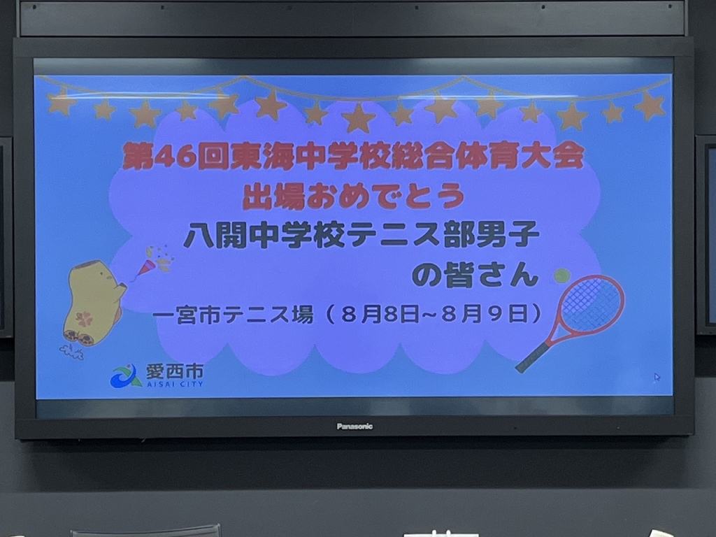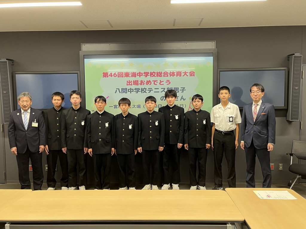 11月5日(火)、男子ソフトテニス部の8名が愛西市役所へ行き、愛西市長を表敬訪問しました。今年の夏の大会で地区大会と西尾張大会で優勝、県大会団体3位により東海大会へ出場した男子テニス部。市長さんからは大会の様子や今後の活動への意気込みなどを聞かれました。8名のうちの5名の3年生は部活動を引退し、現在進学に向けて準備中。部活動で鍛えた集中力を学習にも活かし、残された2年生は、この金字塔を目標にさらに飛躍することを期待しています。
