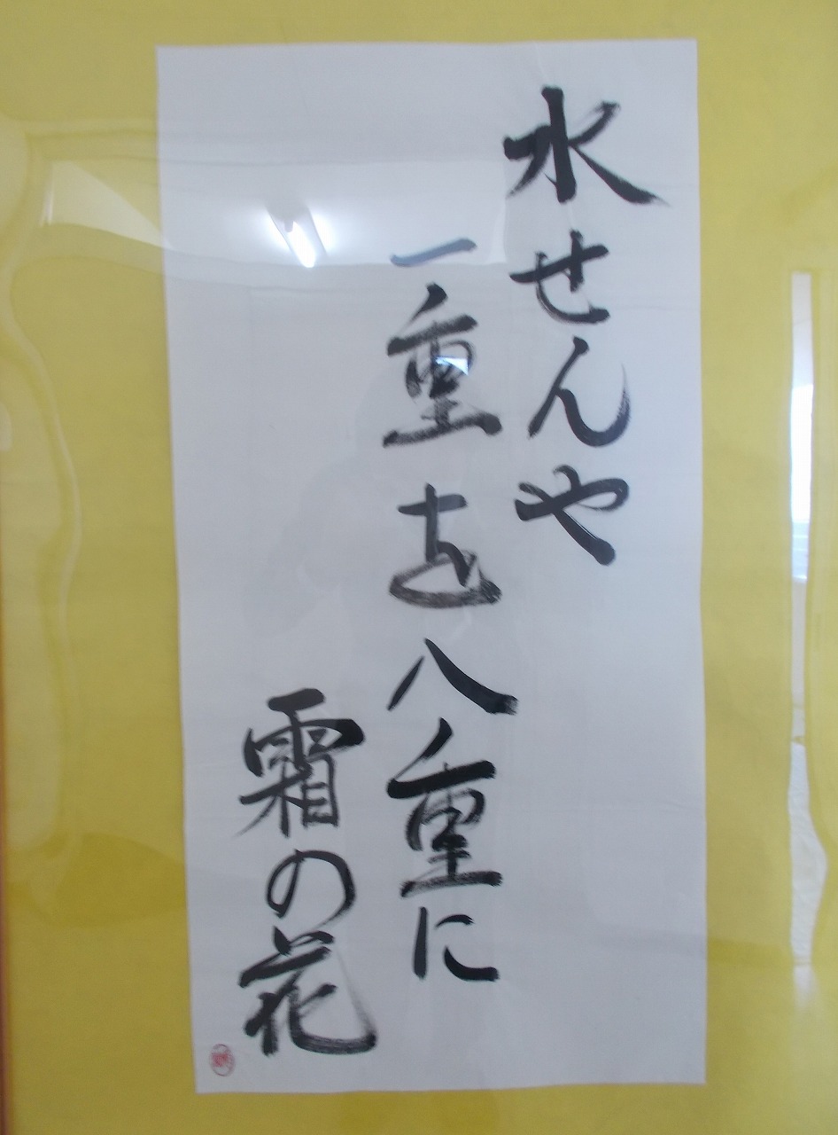 八開中の1階廊下には、毎月、地域の方が横井也有の句を掲示してくださっています。今月は「水せんや 一重を八重に 霜の花」という句です。
