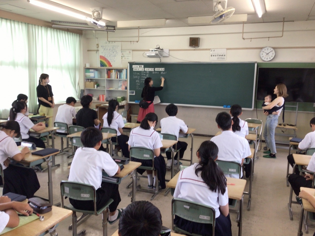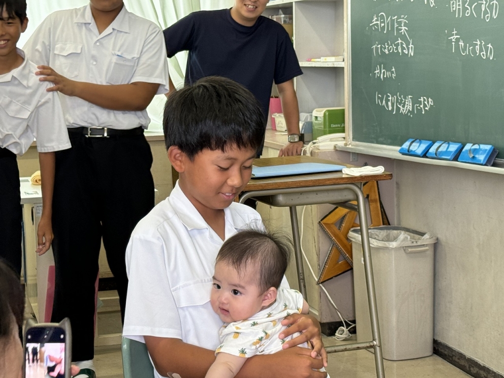 事前におうちの方にインタビューしたり、保健センターの保健師さんや愛西市内の5カ月の赤ちゃんとお母さんに来校していただき、お話を聞いたりしました。また、赤ちゃん人形を使って抱っこの仕方を教えていただき、最後に希望者は本物の赤ちゃんを抱っこさせていただくことができました。ありがとうございました。
