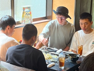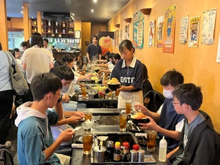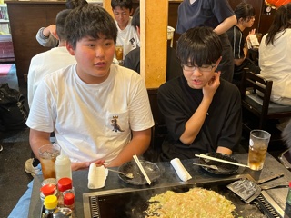 月島でもんじゃ焼きを味わっています。初めは焼き方が分からず戸惑っていましたが、店員さんの教えに従い、すぐに慣れてきました。