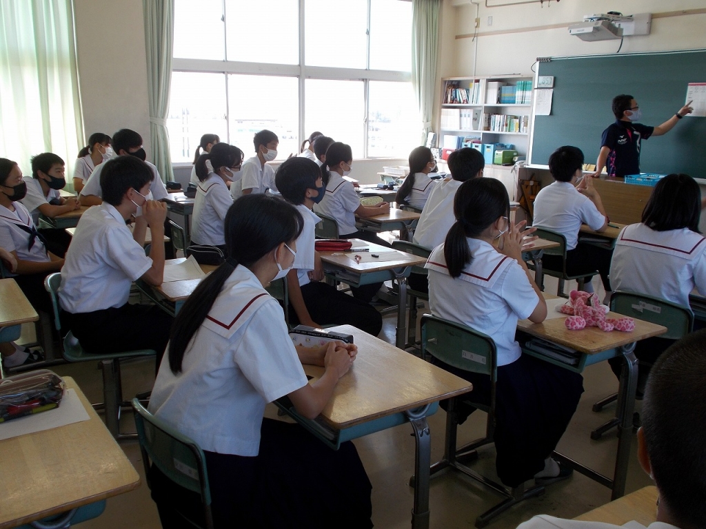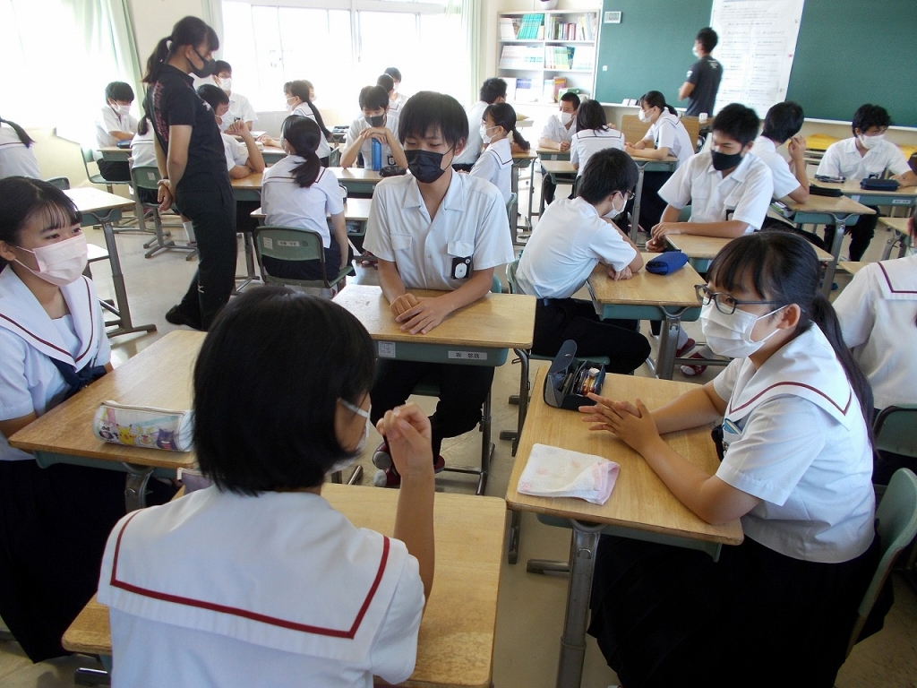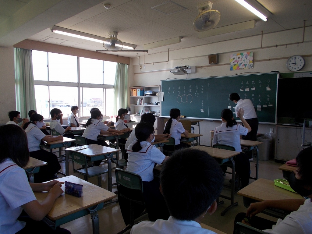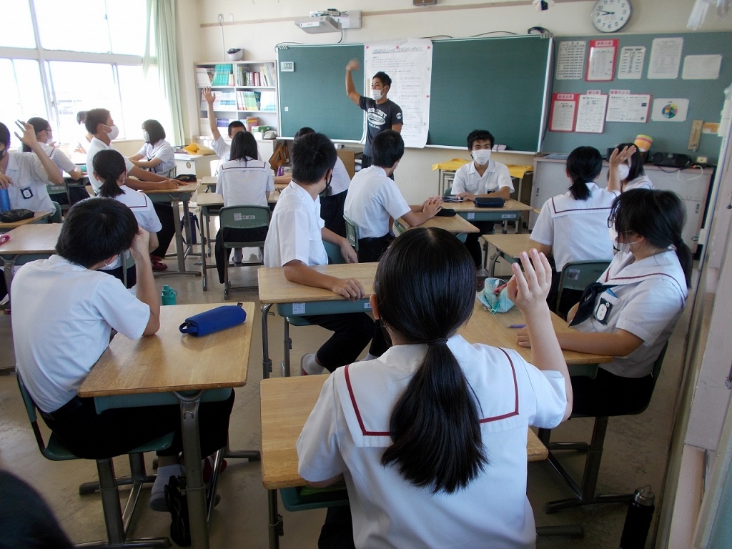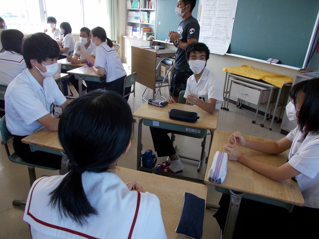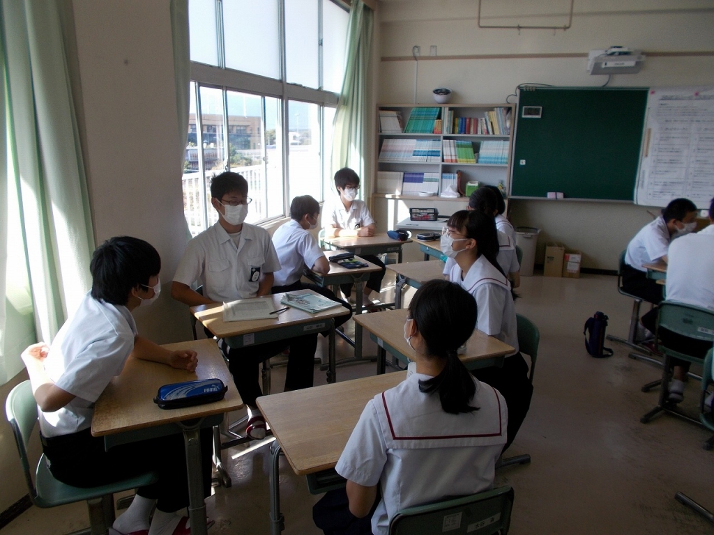 3年生は、「サイコロトーク ~体育祭バージョン~」をしました。4人グループになって、サイコロの出た目に合う話をします。聞いている人はその話題に対して質問をします。「負けないぞ!絶対勝ちたい!と思った競技や活動は何でしたか?」というテーマでは、綱引きやブロック演技の話題が出ていました。全力で頑張った体育祭を思い出し、笑顔で話をしている様子が印象的でした。