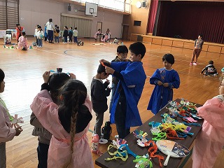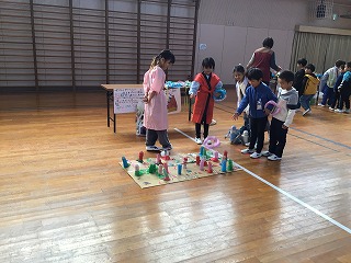 3・4時間目に体育館で2年生生活科の「おもちゃランド」を1年生を招待して行いました。1年生が楽しく遊べるように説明書を書いたり、賞品の手作りメダルを用意したりして、お店屋さんのようにコーナーを設けて活動していました。1年生が楽しく遊んでいる姿を見て、2年生がとても喜んでいました。(本日3・4年生が社会見学に出かけています。その様子は明日お知らせします)